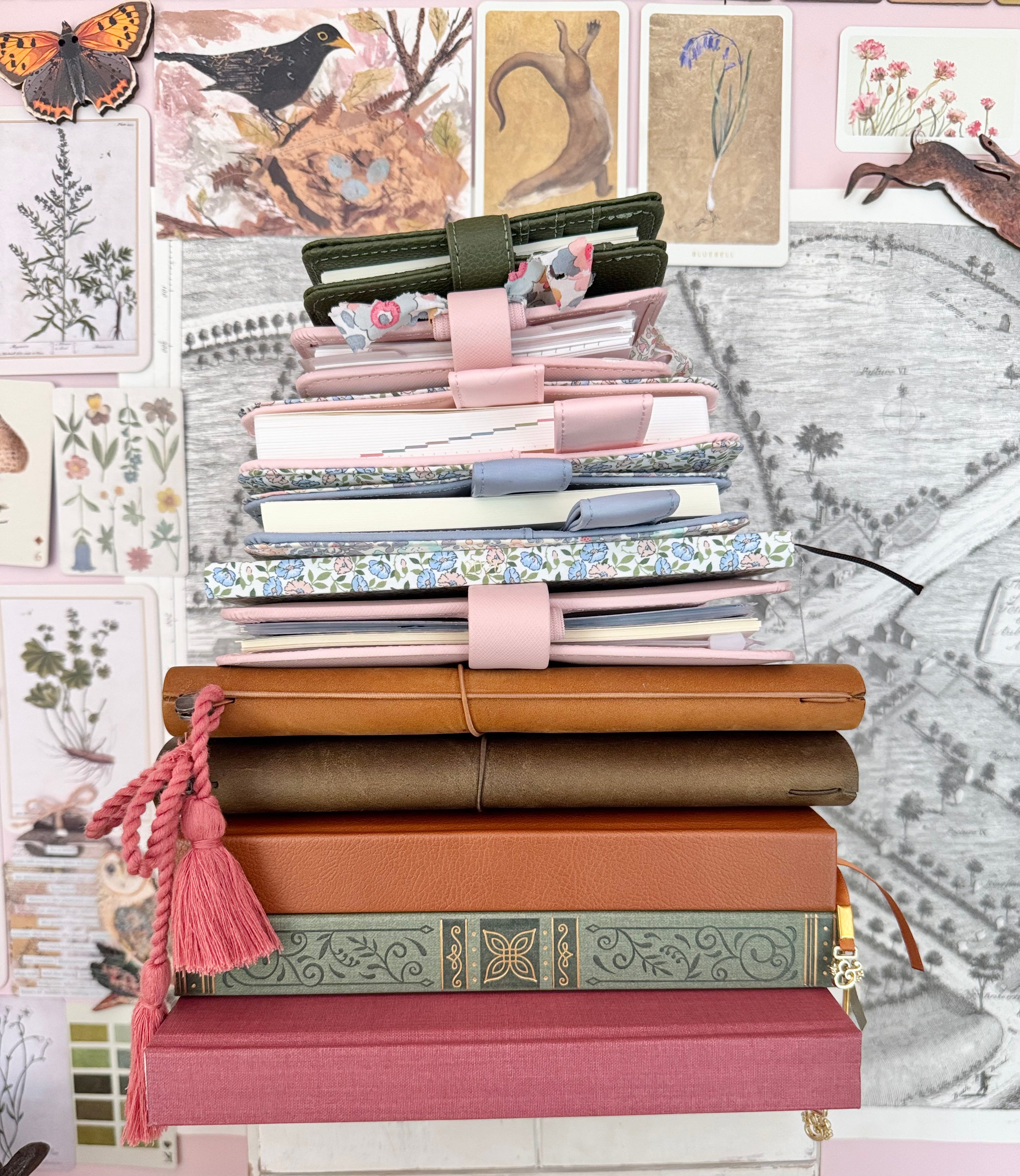It looks like a mega stack, I know, but journalling isn’t just my hobby it’s also my job. In this photo you’ll see the five journals we spoke about, but let’s also look at the others, starting from the pink one and moving right up to the tiny green journal at the top of the pile.